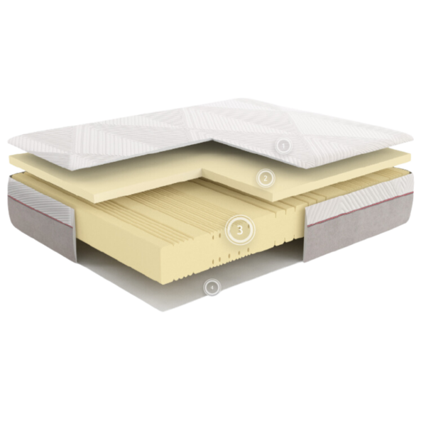 Le matelas Thoor possède une âme composée de deux parties distinctes. La partie supérieure est en mémoire de forme. La partie inférieure est en mousse avec profilage anatomique. Les zones de forte pression ont des épaisseurs plus importantes.